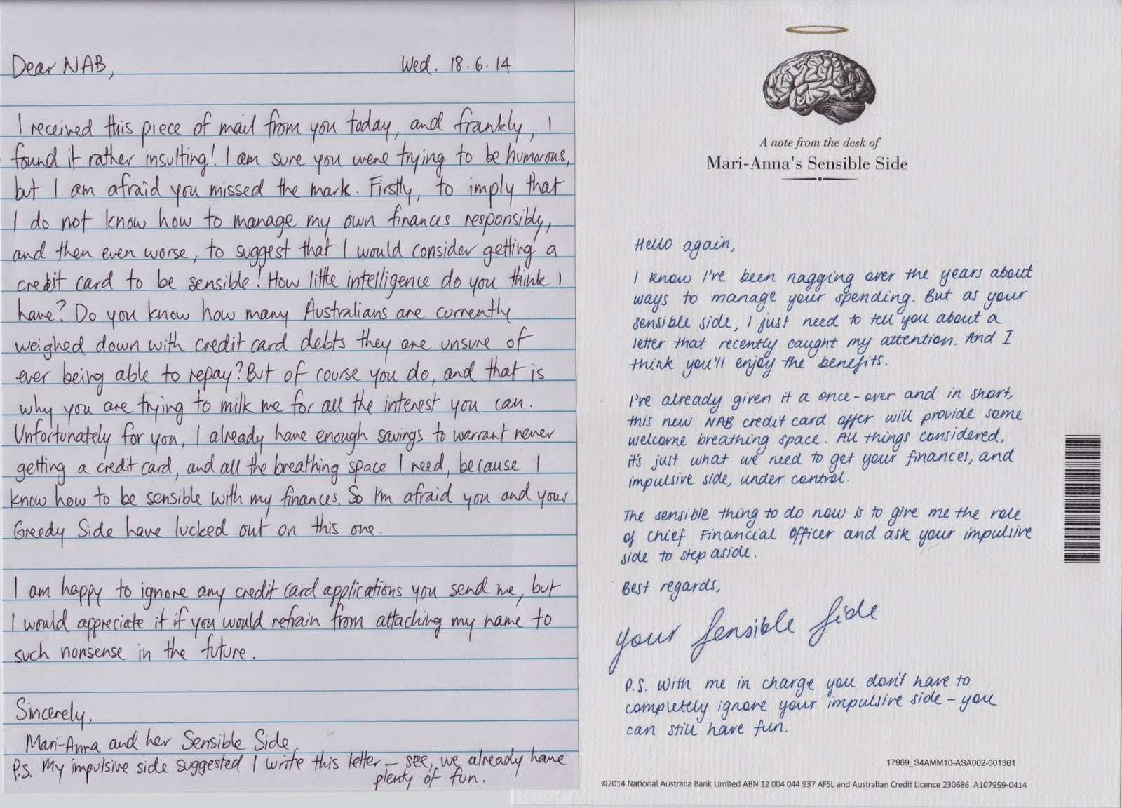 I received this piece of mail from you today, and frankly, I found it rather insulting! I am sure you were trying to be humorous, but I am afraid you missed the mark. Firstly, to imply that I do not know how to manage my own finances responsibly, and even worse, to suggest that I would consider getting a credit card to be sensible! How little intelligence do you think I have? Do you know how many Australians are currently weighed down with credit card debts that they are unsure of ever being able to repay? But of course you do, and that is why you are trying to milk me for all the interest you can. Unfortunately for you, I already have enough savings to warrant never getting a credit card, and all the breathing space I need, because I know how to be sensible with my finances. So I am afraid you and your Greedy Side have lucked out on this one.